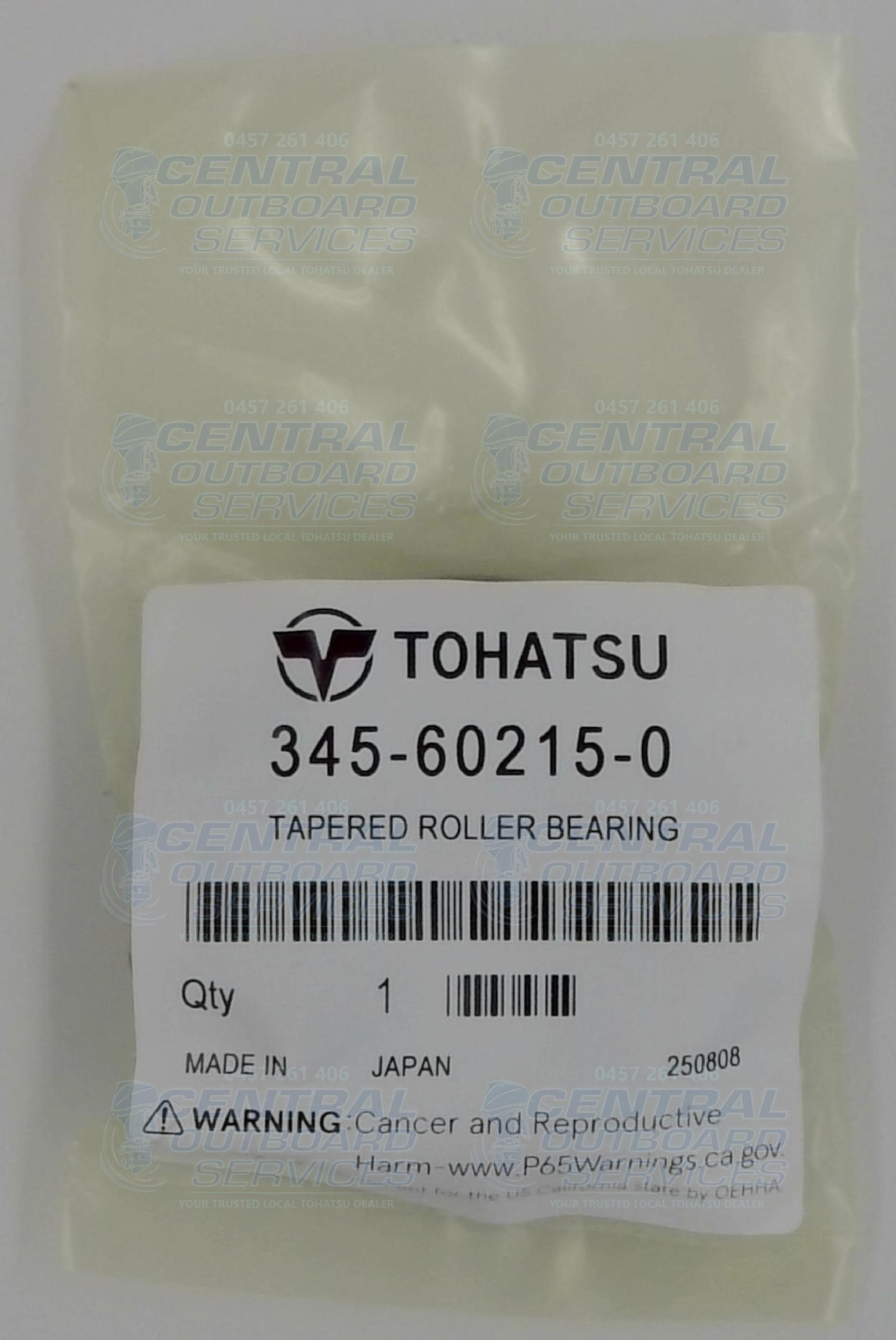 345-60215-0 Tapered Roller Bearing for Tohatsu outboard motors. This OEM bearing is used in the gearcase / propeller shaft assembly to support rotating components and maintain correct alignment under load. Designed to Tohatsu specifications for strength, smooth operation, and long service life in marine conditions.