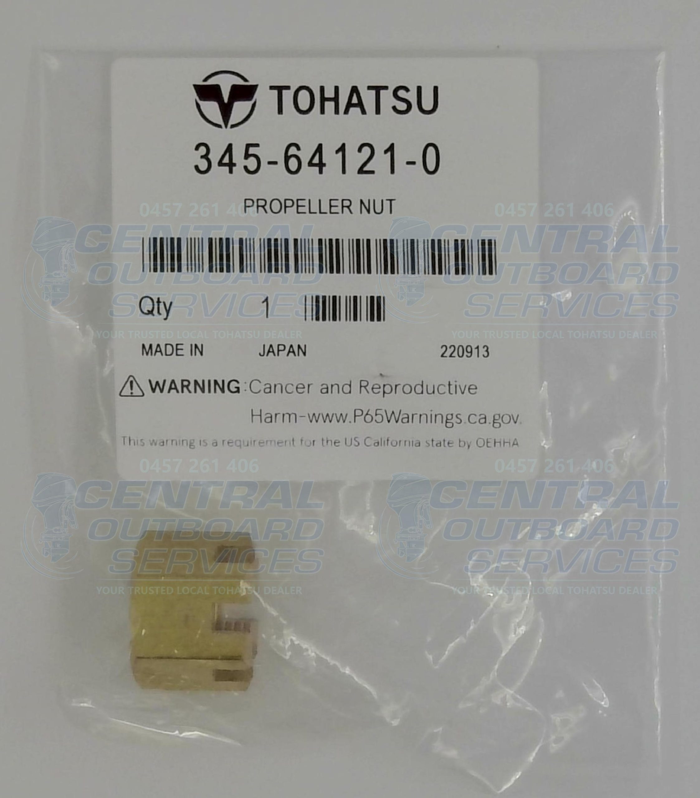 345-64121-0 Propeller Nut from Tohatsu, designed to securely fasten the propeller onto your outboard engine’s propeller shaft. This OEM brass nut provides precise fitment and strong clamping force to prevent loosening under load and vibration. Made to factory specifications, it helps ensure safe, reliable propeller installation and smooth operation on the water.