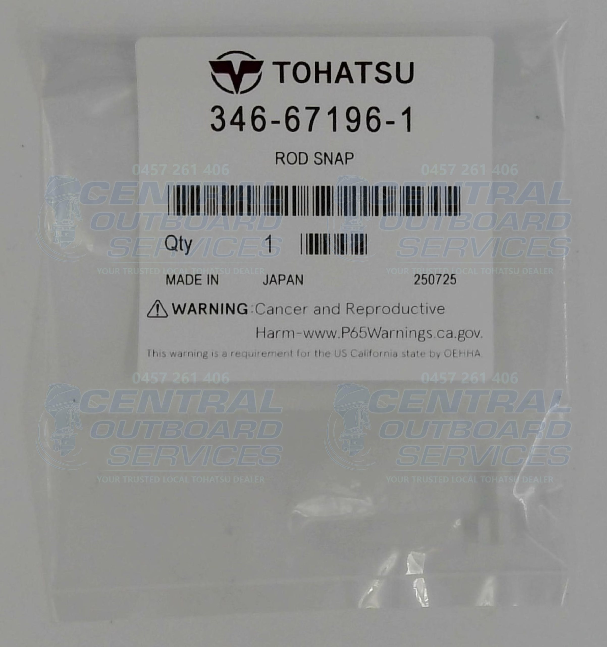 The 346-67196-1 Rod Snap is a genuine OEM link component from Tohatsu, used in the throttle/shift-linkage system of compatible outboard engines. It serves as the snap-connector for the rod assembly, helping ensure secure movement and accurate control. Verified via parts listing on Tohatsu spares site.