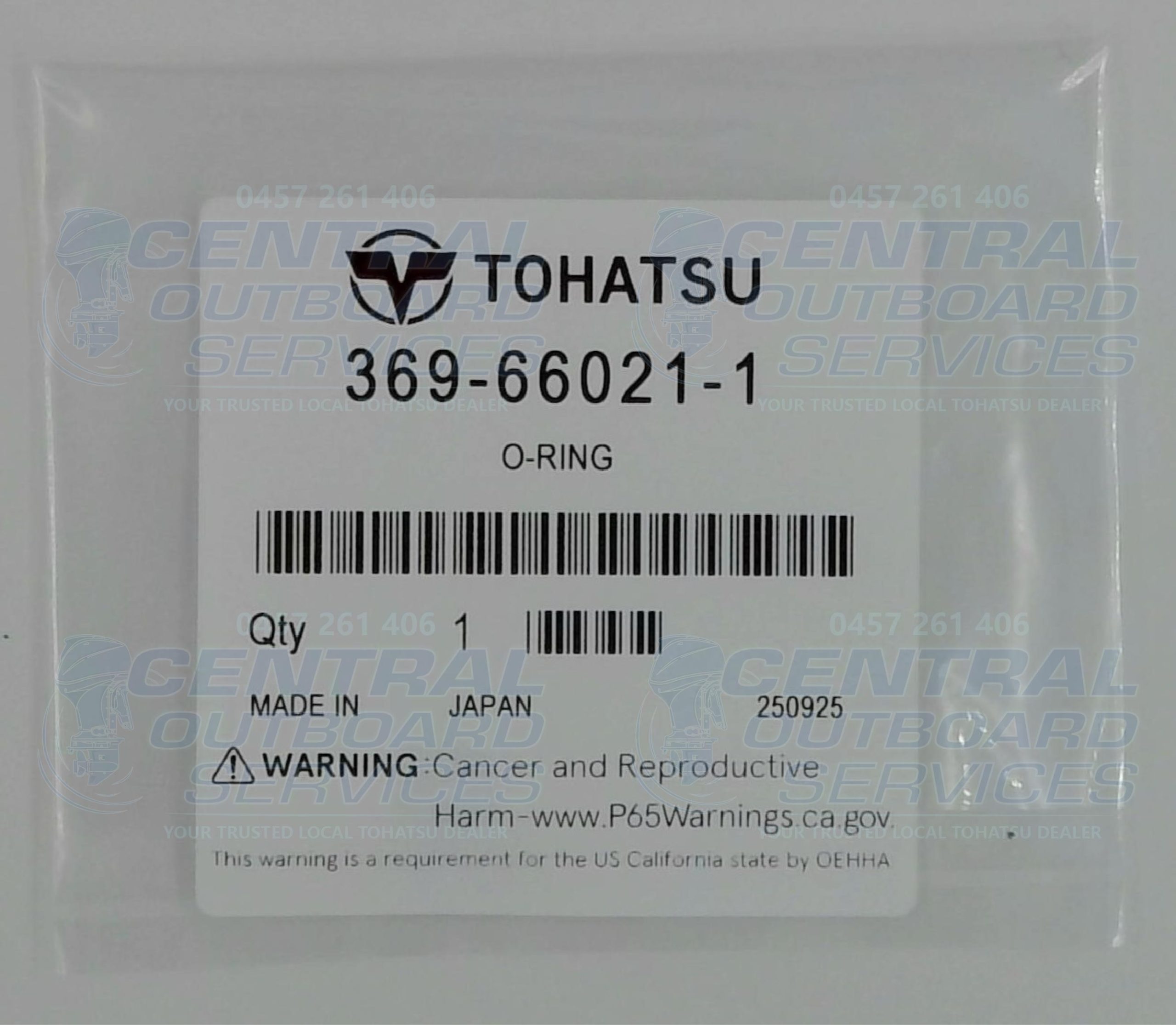 Genuine 369-66021-1 O-Ring from Tohatsu — a precision-molded sealing ring designed to provide a reliable fluid or air seal on compatible outboard engine components. This OEM O-ring helps prevent leaks and maintain proper pressure where connections and moving parts meet. Manufactured to strict Tohatsu specifications from durable materials suited for marine environments, it ensures dependable, long-lasting sealing performance under vibration, moisture, and temperature changes.