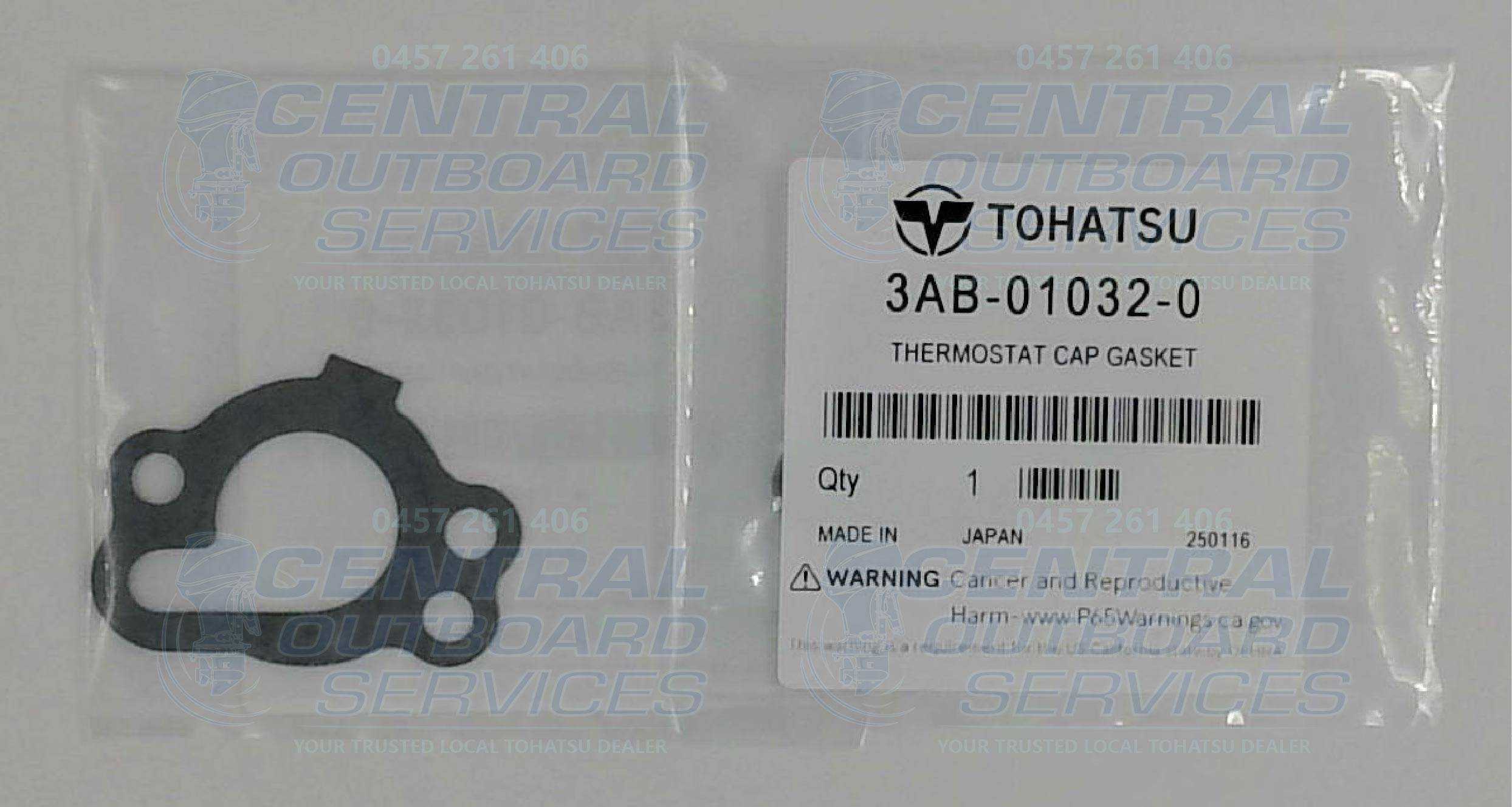 The 3AB-01032-0 is a genuine OEM Tohatsu thermostat cap gasket used in 2.5HP and 3.5HP four-stroke outboard engines.