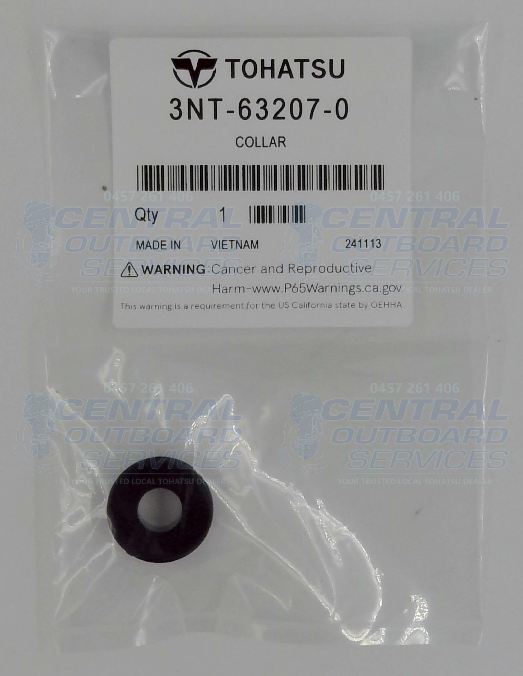 The 3NT-63207-0 collar is a genuine Tohatsu OEM part designed for the tiller-handle/throttle mechanism of various outboard engines. According to official parts listings, the original part number 345-63207-0 (also shown as 345632070M) is used in models such as the 9.9 HP, 15 HP, 18 HP, 25 HP, 30 HP and 40 HP Tohatsu units up to around 2002. It is a small but critical component (a collar bushing) used in the tiller-bar assembly of those motors.